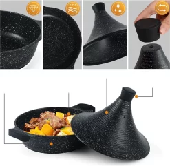 Een grote Aluminium tajine met een diameter van 32 cm en 32 cm hoogte van van uitstekende kwaliteit is voorzien van een anti-aanbaklaag waardoor het eten niet blijft plakken. Ideaal voor de bereiding van vis, vlees en groenten op Marokkaanse wijze. De speciale kegelvorm van het deksel maakt een gelijkmatige condensatie mogelijk zodat gerechten extra mals worden.