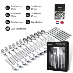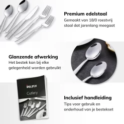 Het prachtige 30-delige bestekset Deluxe van Deleca® brengt klasse op tafel. Met een ergonomisch handvat en een tijdloos ontwerp kan dit glanzende bestek bij elke gelegenheid worden gebruikt.