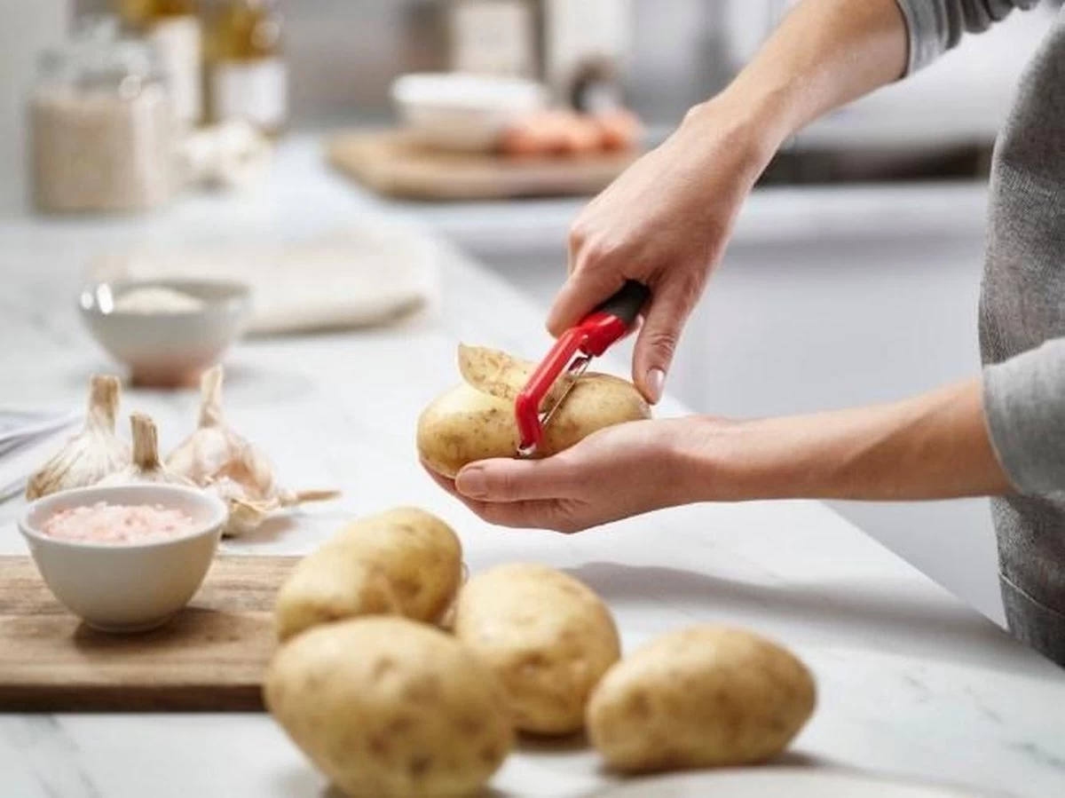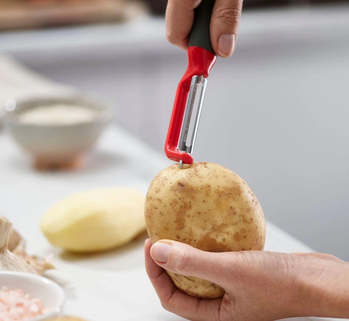 Deze snelle, slanke dunschiller van Joseph Joseph heeft een stevige, gemakkelijke handgreep en een scherp RVS mes. Het mes is draaibaar om altijd contact te houden met het stuk groente voor extra gebruiksgemak en snelheid. De handige tool aan de bovenkant is perfect om de ogen van aardappelen te verwijderen. Na gebruik kan de dunschiller worden schoongemaakt in de vaatwasser al is handwas aan te raden voor een langere levensduur.
