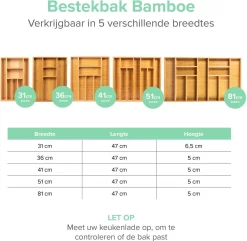 De bestekbak is zeer slijtvast door het zeer sterke bamboe hout en geeft een goede bescherming voor de voorwerpen die in de organizer geplaatst zullen worden. Bij de normale bestekbakken zal ongetwijfeld voorkomen dat de messen door het plastic heen prikken of dat de kwaliteit na enkele weken afneemt. Dit probleem heb je niet met de bamboe bestekbak.