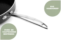 Naast dat het roestvrij staal een luxe uitstraling geeft, is deze handgreep van ISENVI bestand tegen de vaatwasser en kan het handvat niet verkleuren. Daarnaast zorgt dit handvat ervoor dat de pan handig en veilig in gebruik is.