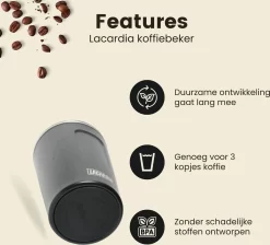 Een koffiebeker to go die niet lekt en je koffie tot 4 uur warm houdt! Koffie of thee, de koffiebeker van LaCardia houd je drank warm en lekker. De koffiemok is 380ML, goed voor 3 kopjes koffie. De koffiebeker is drievoudig geïsoleerd waardoor je koffie of thee extra lang warm blijft. De antislip bodem zorgt ervoor dat de beker moeilijk omvalt en samen met de afsluitbare deksel is de koffiebeker lekvrij en hufterproof.