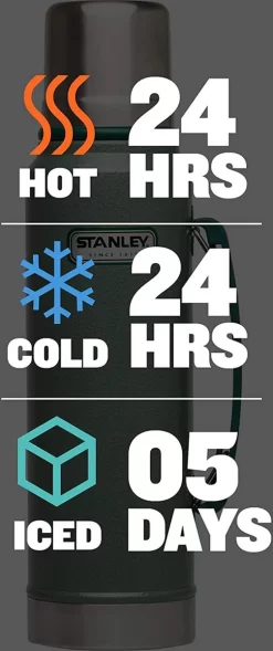 28 uur warm – 28 uur koud Ideaal om warme en koude dranken in mee te nemen. Warme dranken blijven 28 uur warm. Wat verstaat Stanley dan onder warm? Je drank behoudt dan een temperatuur tussen de 100 en 65 graden. Kouden dranken blijven tot wel 28 uur koud; ideaal voor in de zomer!