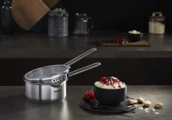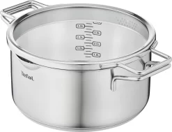 De strakke lijnen, het hoogwaardige geborstelde roestvrij staal en de platte deksel van deze Tefal Nordica Pannenset – 4 delig zorgen ervoor dat je heerlijke gerechten kunt maken. Zonder poespas, maar met het grootste gemak. Dankzij het innovatieve design heeft de Nordica twee grepen aan de zijkant voor het veilig en makkelijk afgieten van kookvocht.