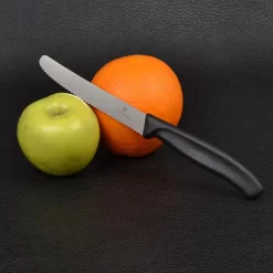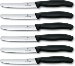 Set van 6 vlijmscherpe tafelmessen van Victorinox, fabrikant van het beroemde “Original Swiss Army Knife”. De gekartelde lemmeten zijn vervaardigd van het beste, hooggelegeerd roestvrije, conische staal. Optimale staalhardheid. Gemaakt met Zwitserse precisie, zo scherp als een scheermes. De heften van zwarte Polypropyleen kunststof liggen uitstekend in de hand. Vaatwasserbestendig. Levenslang gegarandeerd tegen materiaal- en fabricagefouten. Verpakt op skin. Koken is meer dan alleen het bereiden van voedsel. Koken moet ook plezierig zijn en het kiezen van het juiste keukengereedschap is van cruciaal belang. Victorinox heeft het juiste hulpje voor iedere job – functionele producten van hoge kwaliteit – zoals je mag verwachten van de bedenker van het originele “Swiss Army Knife”. Levenslang gegarandeerd tegen materiaal- en fabricagefouten. Dit model kan in de vaatwasmachine, maar het wordt niet aanbevolen! Het model 6.7833.6 is de opvolger van het model 5.1333.”